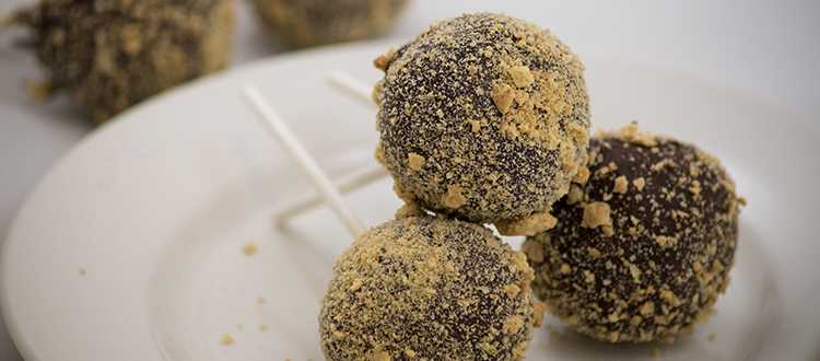 - Melt down the remaining chocolate in 30 second intervals in your microwave, stirring between intervals until melted. Remove the cake pops from the refrigerator and begin dipping. Use a skewer to help ease off excess chocolate when you dip, or you can also gently tap the pops on the side of the bowl. Roll the ball in graham, and place stick side down into a pre-punch card board box. If you place them back down with the cake side down, this will create a little “foot” on each pop.